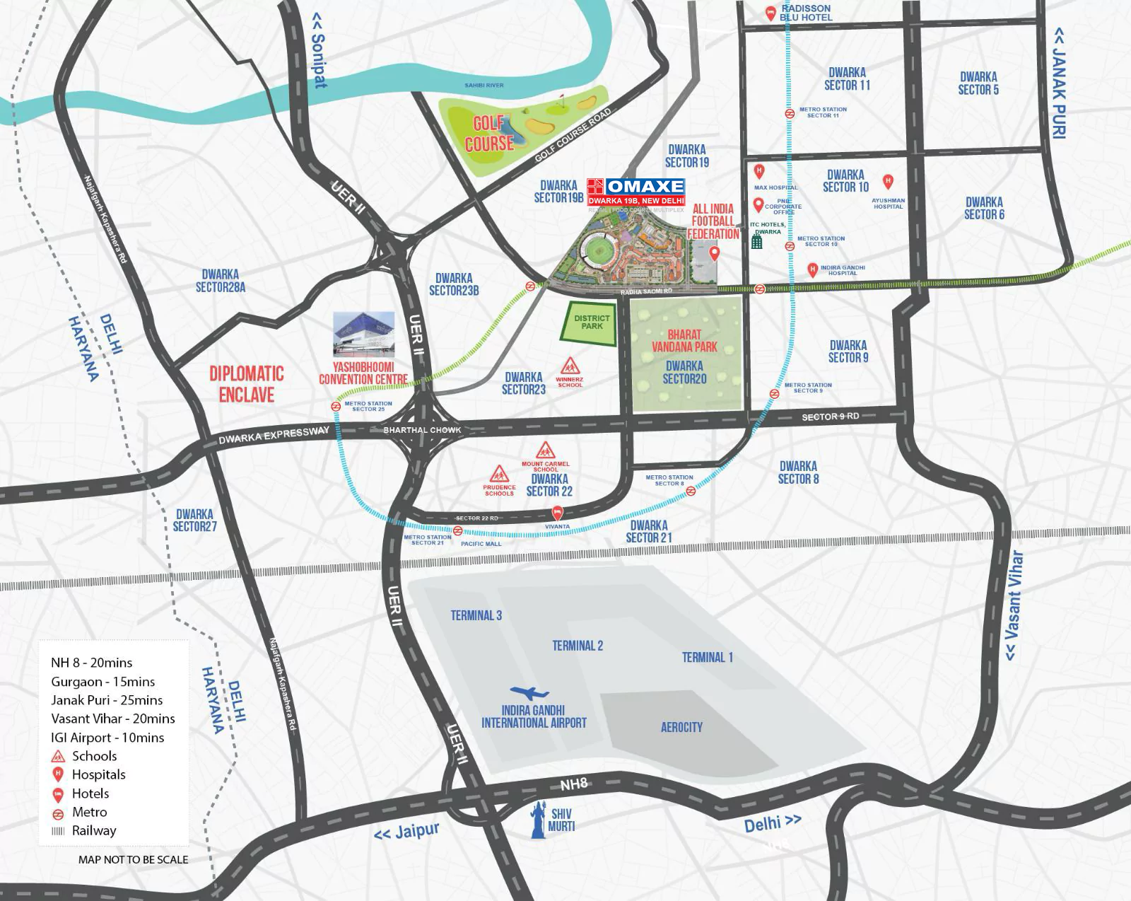Strategically situated in Sector 19B, Dwarka, Omaxe Dwarka offers unparalleled convenience. Located directly opposite Bharat Vandna Park and just minutes from IGI Airport, it ensures effortless access for both residents and visitors. The Omaxe Mall in Sector 19B serves as a premier commercial hub, featuring retail shops, anchor stores, food courts, high-street outlets, multiplex cinemas, and more. Designed to deliver a fully immersive shopping experience, it is poised to become a landmark destination in the city.